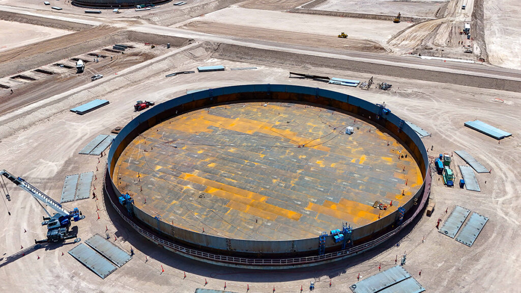 La terminal de exportación de Punta Colorada, ubicada en el Golfo San Matías, concentra actualmente el mayor volumen de tareas. Allí se construyen seis tanques de almacenamiento de 120.000 metros cúbicos cada uno, con distintos grados de avance. Dos de ellos ya completaron las estructuras principales, mientras los restantes avanzan en etapas de impermeabilización, protección catódica y montaje de domos.