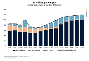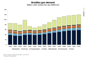 Por W. Schreiner Parker, director general para América Latina de Rystad Energy. A pesar de toda la incertidumbre en el mercado de gas del Cono Sur, la única constante es que la demanda brasileña seguirá creciendo sustancialmente hasta 2030 y más allá. Desde un mínimo de 69 millones de metros cúbicos por día (MMcmd) de demanda el año pasado, se espera que esa cifra aumente a más de 120 MMcmd para 2032, un aumento del 74% en nueve años.