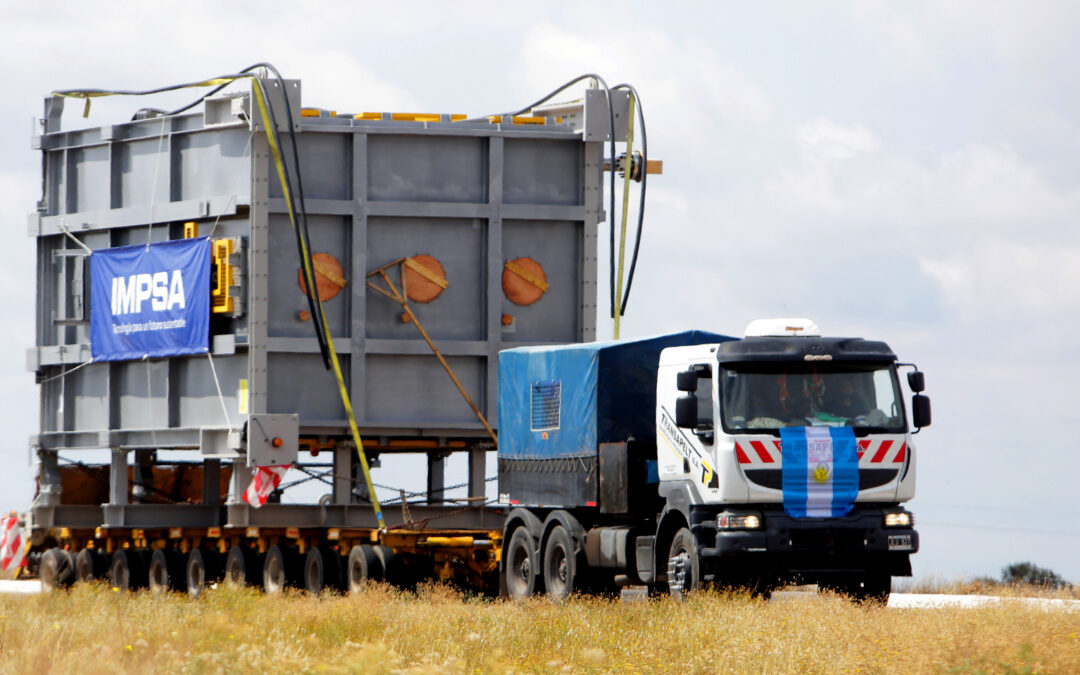 A través de su empresa Transapelt, Impsa inició el sábado el traslado de lo que se conoce como Radiación, una de las cuatro piezas que componen el horno, que tiene una altura de 9,7 metros y un peso de 62 toneladas.