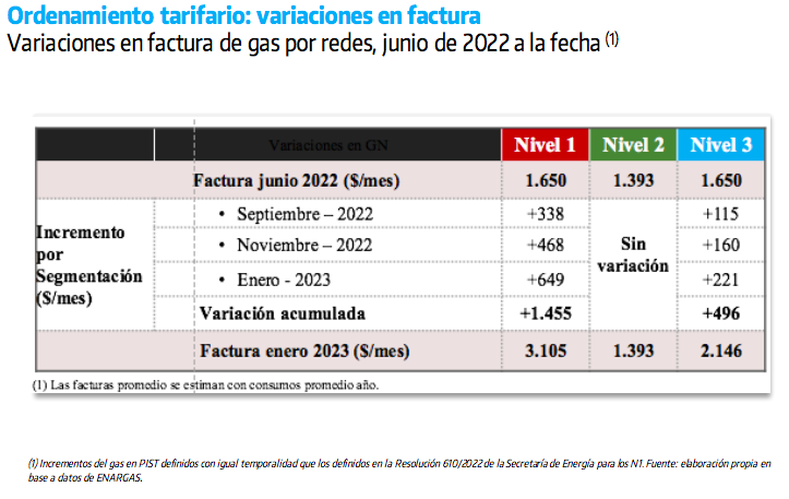 Bernal indicó que un usuario de nivel 3 (sectores medios) que en junio abonó una factura de gas de $ 1.650, al final de la quita gradual del subsidio pagará $ 2.146, lo que implica un ajuste del 30,06% (496 pesos más). Mientras que para los del nivel 1 (los más ricos que no tendrán ningún subsidios), la factura ascenderá a $3.105, con lo cual el aumento en enero será del 88% en relación a las facturas de junio, es decir $1.455.