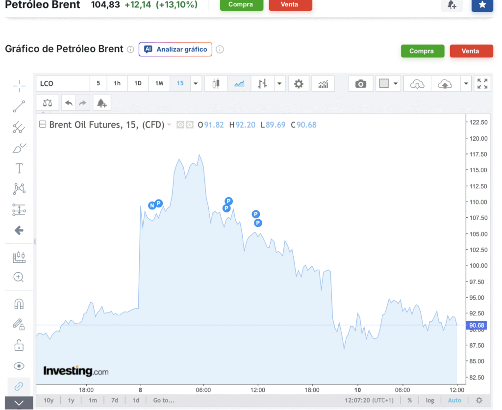 Ayer lunes fue una jornada de infarto para los algoritmos de Wall Street y las operadoras globales. Al inicio de la sesión, ante los incesantes bombardeos sobre Teherán y las represalias que no mostraban signos de cesar, el pánico por el desabastecimiento empujó los precios al borde de los 120 dólares por barril.