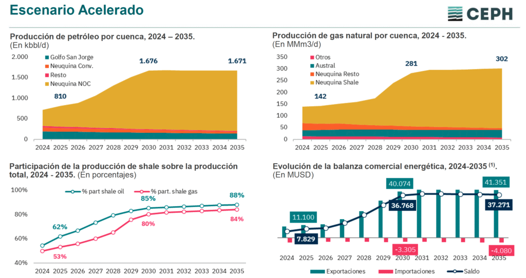 La verdadera transformación ocurre en el escenario expansivo. Si Argentina despeja el horizonte macroeconómico, la producción de petróleo treparía a 1.688 kbbl/d en 2035, casi el doble de la realidad actual. En gas, el salto es similar: de los 161 MMm3/d actuales a 301 MMm3/d.