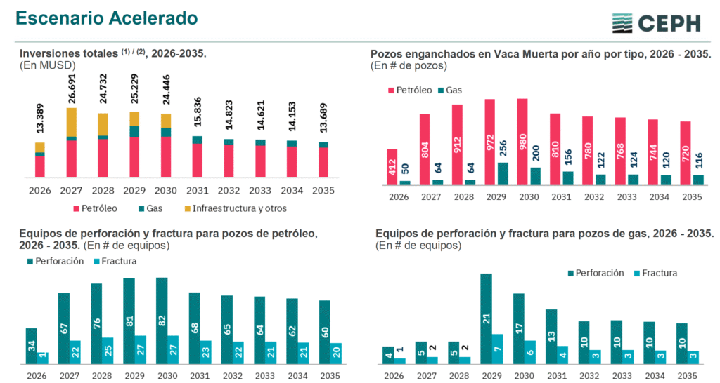 El tercer escenario, el acelerado, propone un shock de actividad inmediato. Aquí, la diferencia con la actualidad es más drástica en el corto plazo. Las inversiones alcanzarían un pico de 26.691 millones de dólares ya en el año 2027. El objetivo es maximizar la extracción de recursos antes de que la transición energética global reduzca la demanda de hidrocarburos.